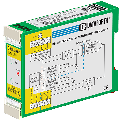 Each DSCA40/41 voltage input module provides a single channel of analog input which is filtered, isolated, amplified, and converted to a high-level voltage output. Signal filtering is accomplished with a five-pole filter. An anti-aliasing pole is located on the field side of the isolation barrier, and the other four poles are on the system side. After the initial field-side filtering, the input signal is chopped by a proprietary chopper circuit. Isolation is provided by transformer coupling, again using a proprietary technique to suppress transmission of common mode spikes or surges.Module output is either voltage or current. For current output models a dedicated loop supply is provided at terminal 3 (+OUT) with loop return located at terminal 4 (-OUT). The system-side load may be either floating or grounded.