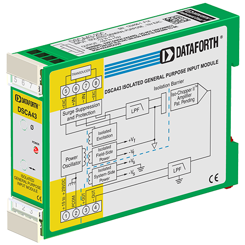 Each DSCA43 general purpose input module provides a single channel of transducer input which is filtered, isolated, amplified, and converted to a high-level voltage output. Signal filtering is accomplished with a five-pole filter which is optimized for step response. An anti-aliasing pole is located on the field side of the isolation barrier, and the other four poles are on the system side. After the initial field-side filtering, the input signal is chopped by a proprietary chopper circuit. Isolation is provided by transformer coupling, again using a proprietary technique to suppress transmission of common mode spikes or surges.Transducer excitation is provided from the module by a stable 10V source. This source is fully isolated, allowing the amplifier inputs to operate over the full range of the excitation voltage. This feature enables the module to be interfaced to a wide variety of sensors requiring exctitation.