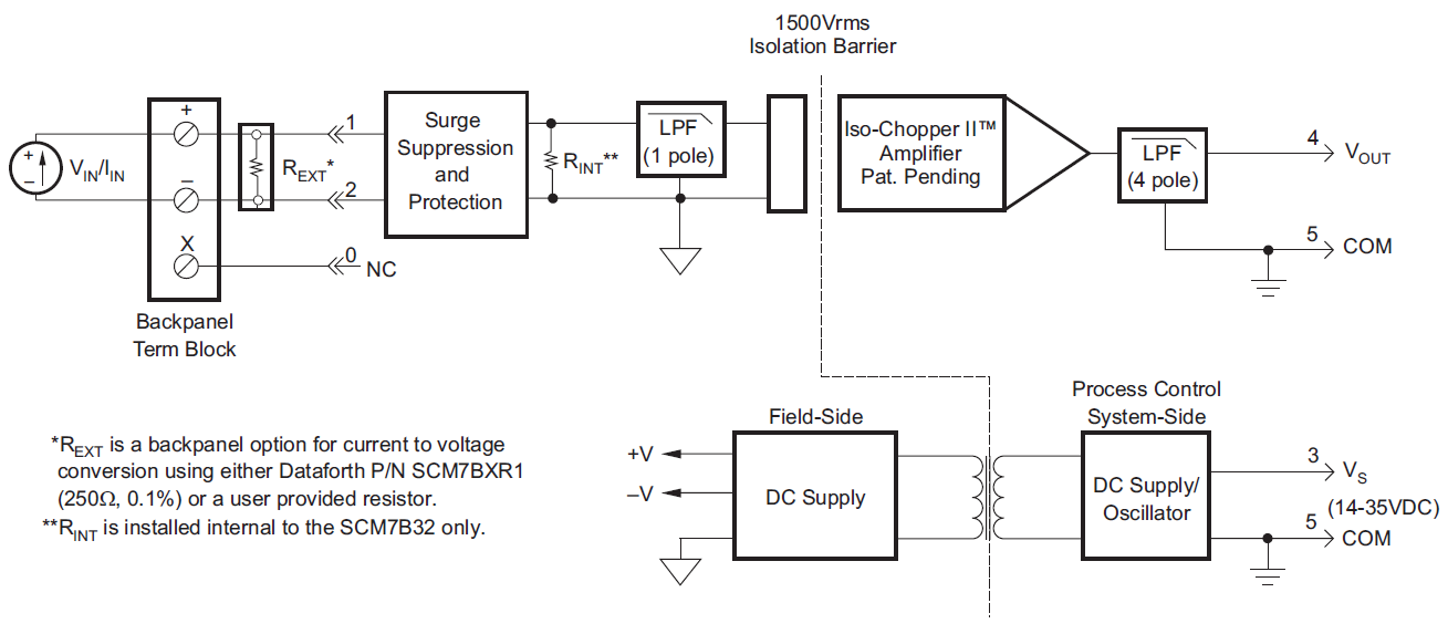 After the initial field-side filtering (conversion-SCM7B32 only), the input signal is chopped by a proprietary chopper circuit and transferred across the transformer isolation barrier, suppressing transmission of common mode spikes and surges. The signal is then reconstructed and filtered for process control system output.