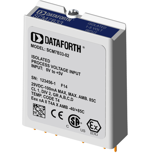 The SCM7B32 current input modules accept input signals in the 4-20mA or 0- 20mA ranges from the field and provide a high-level output to the process control system. Current to voltage conversion occurs internal to the module, which is factory calibrated to ensure the highest accuracy.SCM7B33 voltage input modules accept input signals in the +1V to +5V or 0 to +5V ranges from the field and provide a high-level output to the process control system. As an alternative, the SCM7B33 can be used with an external 250 ohm resistor (Dataforth SCM7BXR1 or equivalent), to accept input signals in the 4-20mA or 0-20mA ranges. Using the external sense resistor allows the module to be removed without disrupting the current loop. All SCM7B33s are shipped with a SCM7BXR1 resistor.