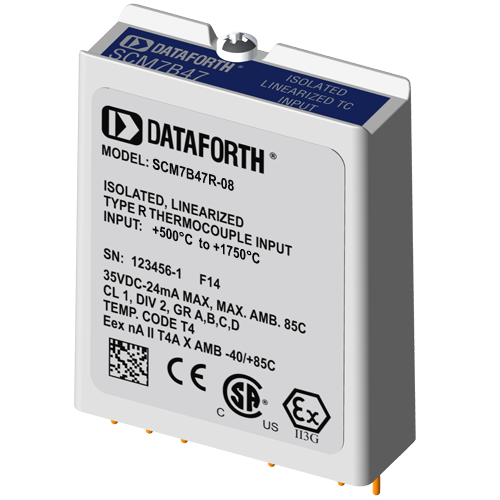 SCM7B47 modules accept a single channel of input from Type J, K, T, E, R, S, B, or N thermocouples. The signal is filtered, isolated, amplified, linearized, and converted to a high-level analog voltage for output to the process control system.Linearization is achieved by creating a non-linear transfer function through the module itself; refer to AN505. This non-linear transfer function is configured at the factory and is designed to be equal and opposite to the thermocouple non-linearity.