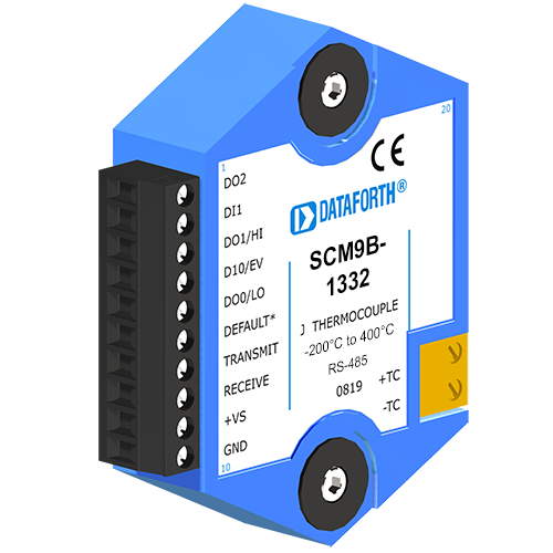 The SCM9B-1000/2000 Sensor-to-Computer Modules are a family of complete solutions designed for data acquisition systems based on personal computers and other processor-based equipment with standard serial I/O ports. The modules convert analog input signals to engineering units and transmit in ASCII format to any host with standard RS-485 or RS-232C ports. These modules can measure temperature, pressure, voltage, current and various types of digital signals. The modules provide direct connection to a wide variety of sensors and perform all signal conditioning, scaling, linearization and conversion to engineering units. Each module also provides digital I/O lines for controlling devices through solid state relays or TTL signals. These digital I/O lines along with built-in limit setting capability provide alarm and control outputs.The modules contain no pots or switches to be set. Features such as address, data rate, parity, alarms, echo, etc. are selectable using simple commands over the communications port—without requiring access to the module. The selections are stored in nonvolatile EEPROM which maintains data even after power is removed.
