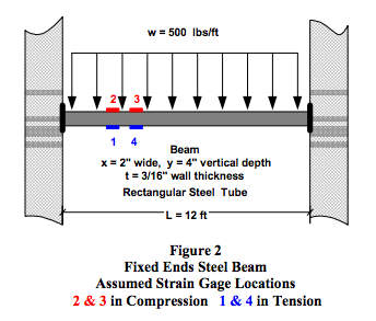 The following examples explore different strain gage bridge circuit topologies for measuring deflection and strains of the beam configuration illustrated in Figure 2. The strain gage instrumentation methods applied to the beam illustrated in Figure 2 are presented as examples for exploring electrical behavior of various strain gage bridge circuit topologies. This particular beam example is not a Dataforth recommendation for fixed beam strain gage instrumentation. The objective of these topology examples is to examine electrical behavior and associated errors when interfacing these circuit topologies with Dataforth’s strain gage bridge SCMs. The basic strain gage specified in Table 2 is used throughout these examples.The fixed beam configuration detailed in Figure 2 is a rectangular steel tube beam 12 feet long with a cross sectional area 2 inches wide by 4 inches vertical depth. Wall thickness of this tube is 3/16 inch. Beam ends are welded to stationary fixtures and a load density, “w,” of 500 pounds per foot is distributed over the beam’s length. Envision this structure as a support beam for a loading platform. Equations for this beam’s deflection and strain are based on approximate first order theory and are limited to uniaxial longitudinal strain and stress.